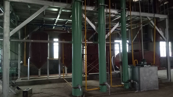 造粒后的含油白土由輸送機輸送至浸出罐上部的進料絞龍再由絞龍分料給浸出罐,當一個浸出罐達到一定料位時關閉這個進料閥打開另一個浸出罐進料閥,以此類推。第一個浸出罐料位達到關閉進料閥后,將預熱的新鮮溶劑打進這個浸出罐,進夠一定量的溶劑后打開混合油循環(huán)泵,經(jīng)過一定時間循環(huán)浸泡后白土內(nèi)的油脂被萃取出來,萃取得到的混合油由混合油泵打入混合油罐。